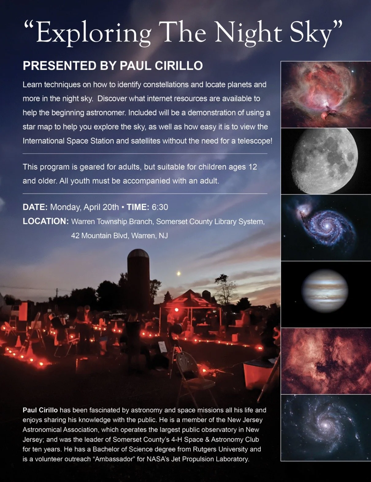 Join Paul Cirillo to learn techniques for identifying constellations and locating planets while discovering essential internet resources for the beginning astronomer. This educational session includes a star map demonstration and tips for viewing the International Space Station and satellites without a telescope; the program is geared for adults and children ages 12 and older.
